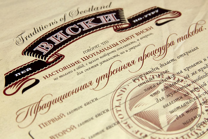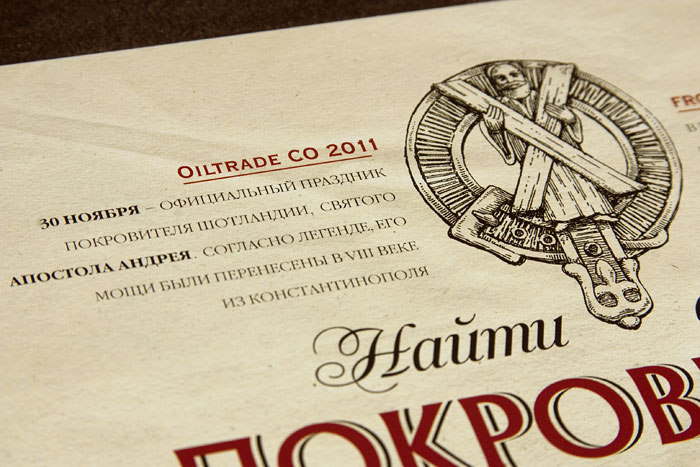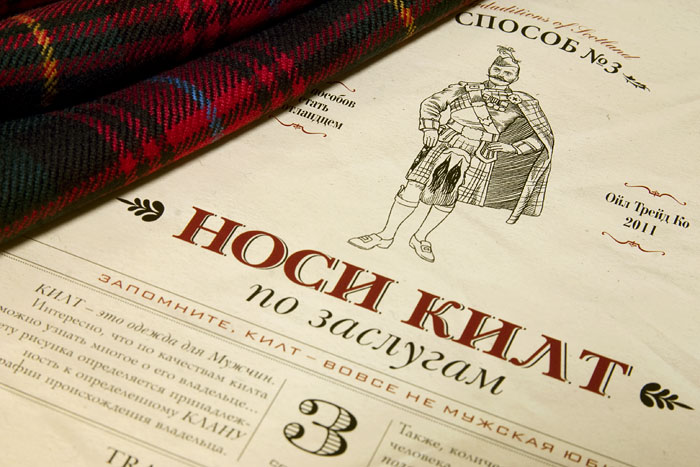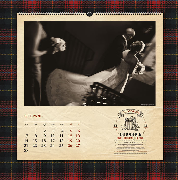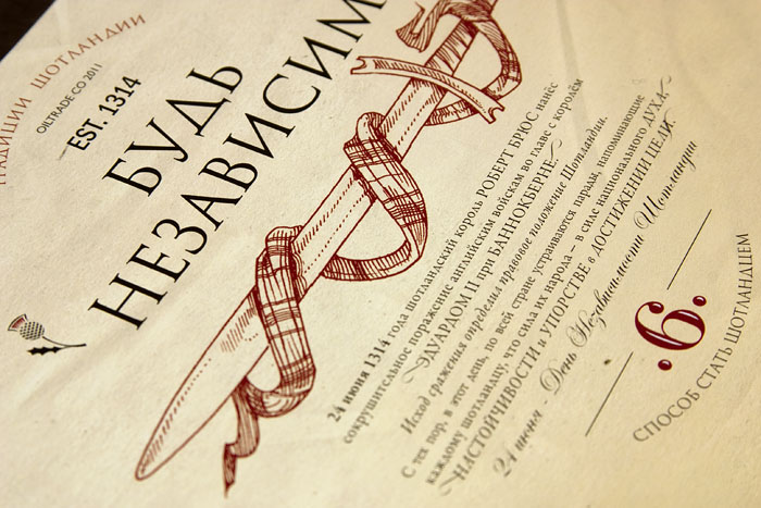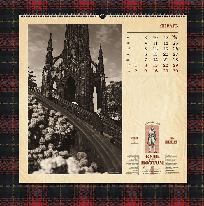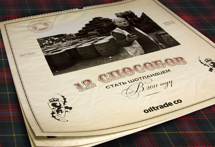 «Фронт:Дизайн» рассказал о 12 способах стать шотландцемАгентство опубликовало календарь компании Oil TradeКаждый год, компания Oil Trade, официальный дистрибьютор ExxonMobil, представляет своим деловым партнерам очередной календарь с авторскими фотографиями из разных стран. В 2011 году Григорий Ярошенко, бессменный фотограф календаря, посетил Шотландию, откуда привез множество аутентичных сюжетов о суровых буднях и безудержных праздниках этого северного края. И каждый год брендинговое ателье FRONT:DESIGN придумывает единую концепцию, объединяющую все представленные в календаре сюжеты. Из простого фоторепортажа календарь превращается в захватывающее повествование, которое хочется непременно досмотреть до конца, и потом жалко снять со стены. В прошедшем году «Фронт:Дизайн» рассказывал о двенадцати способах стать шотландцем. Каждый фотосюжет календаря сопровождался авторскими иллюстрациями и кратким рассказом, развеивающим мифы об этом суровом крае, либо повествующем об очередной традиции шотландцев.