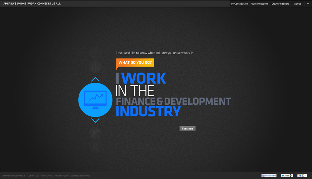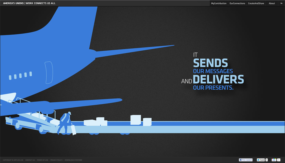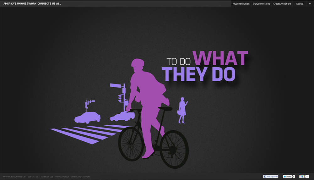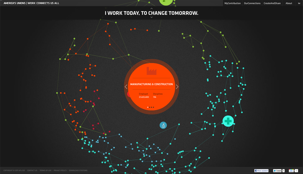 Freeger.com и B-reel New York попробовали поднять авторитет американских профсоюзовИх проект показывает, как работа одного человека влияет на общество в целомРоссийский продакшн Freeger совместно с агентством B-reel New York запустили проект для Американской Федерации Профсоюзов (AFL–CIO) под названием Work Connects Us All (workconnectsusall.org) . Проект призван рассказать людям как их работа влияет на общество и как они могут быть связаны с людьми из других профессий. Патриотичный проект направлен на поднятие авторитета американских рабочих профсоюзов среди населения США. Для того, чтобы стать частью проекта, достаточно зайти на сайт, ввести сферу деятельности, штат, специальность и имя. После просмотра небольшой интерактивной презентации выбранной сферы, вы увидите себя на большой карте связей вместе с другими. Креатив для рекламной кампании разрабатывался агентством SS+K