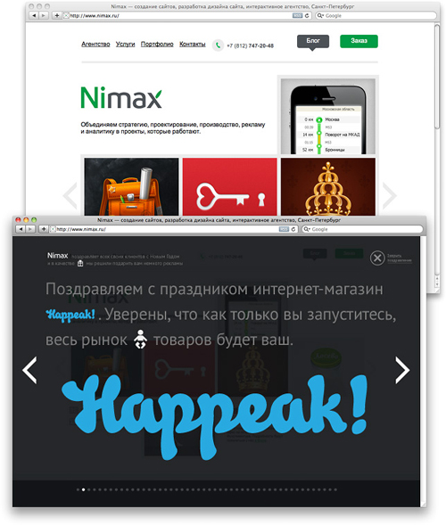 Поздравление от агентства «Nimax»На Новый год люди делают подарки родным и близким, а представители бизнеса по традиции готовят поздравления для своих клиентов и партнеров.Чтобы новогодние поздравления не превратились в снежинки на сайте или флэш-открытки для клиентов, в агентстве "Nimax" провели несколько мозговых штурмов и попробовали найти альтернативные возможности напомнить о себе. В результате в "Nimax" решили на все новогодние каникулы превратить корпоративный сайт агентства в рекламу своих клиентов. С конца декабря до середины января - при входе на сайт, все посетители будут видеть огромные логотипы заказчиков агентства и поздравления для них. После серии мозговых штурмов, у "Nimax" осталось несколько нереализованных идей, которыми они охотно поделились. Если вы все еще думаете над тем, как поздравлять своих клиентов, вы можете использовать одну из них, и сделать: