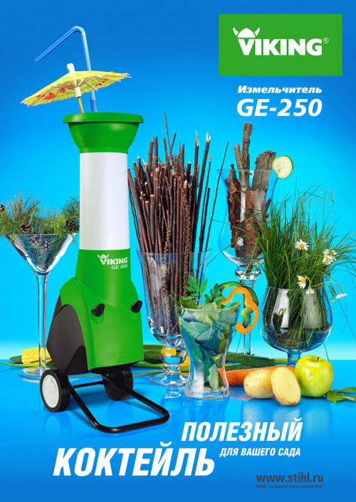 Объектом рекламы стал измельчитель VIKING GE-250, помогающий в переработке садовых отходов - веток, травы, сорняков. С его помощью можно не только легко избавиться от громоздкого мусора, но и использовать его в качестве естественного и полезного удобрения для сада. Созданная креативная концепция отражает основные качества продукта: измельченные с помощью него растительные отходы превращаются в полезный коктейль для почвы, делая сад не только чистым и аккуратным, но и плодородным. Этот образ одновременно раскрывает темы здоровья, драйва, легкости и эстетики, позиционируя измельчитель VIKING не только как выгодное, но и приятное приобретение. Рекламный слоган - "Полезный коктейль для вашего сада", - поддерживает концепцию и усиливает ее. Креативное рекламное агентство Икраткое сотрудничает с группой компаний STIHL и компанией VIKING уже год и разработало для них рекламный ролик о весенней акции на мотокосы и бензопилы, транслировавшийся по федеральным каналам, и серию другой рекламной продукции на основе данной концепции. Так же была разработана реклама культиваторов VIKING и многое другое. Состав творческой группы: