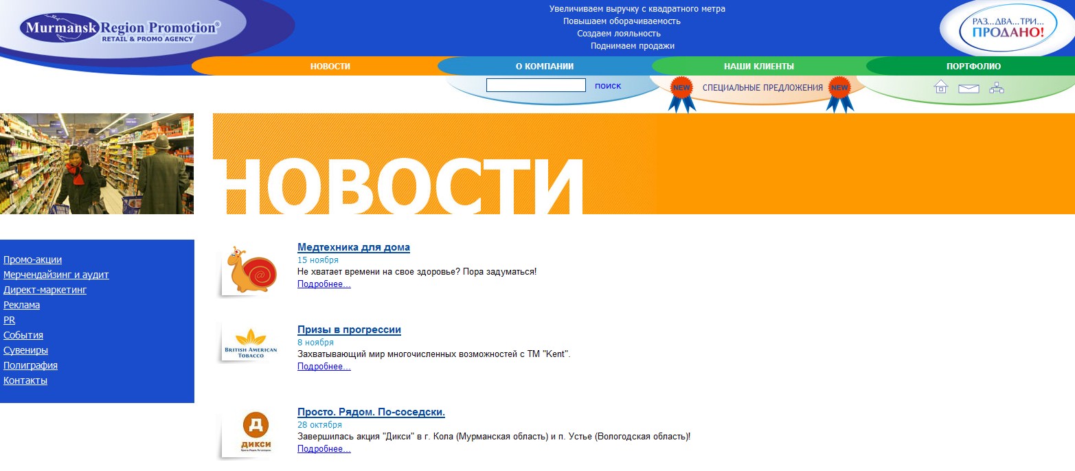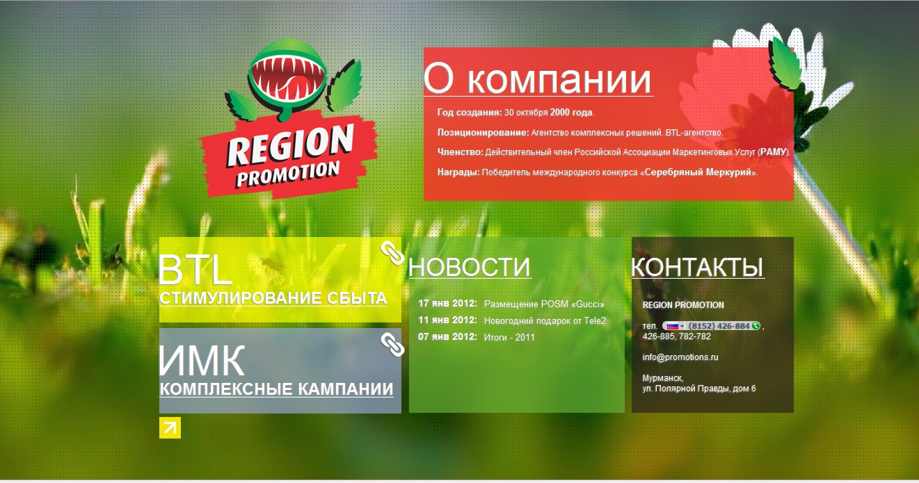 Murmansk Region Promotion лишилось МурманскаМурманское рекламное агентство провело ребрендингBTL-агентство Murmansk Region Promotion превратилось в РА REGION PROMOTION. Изменения коснулись названия компании, а также логотипа, визуализации и оформления сайта. Ребрендинг агентства связан, прежде всего, с репозиционированием. Раньше компания функционировала как промо-агентство в рамках конкретного региона (Мурманская область). Сейчас REGION PROMOTION помимо основного направления - BTL, предложило своим клиентам комплексные маркетинговые программы. Кроме того, изменения коснулись и географии деятельности - REGION PROMOTION вышло за пределы Кольского полуострова и начало реализацию проектов на Северо-Западе России.