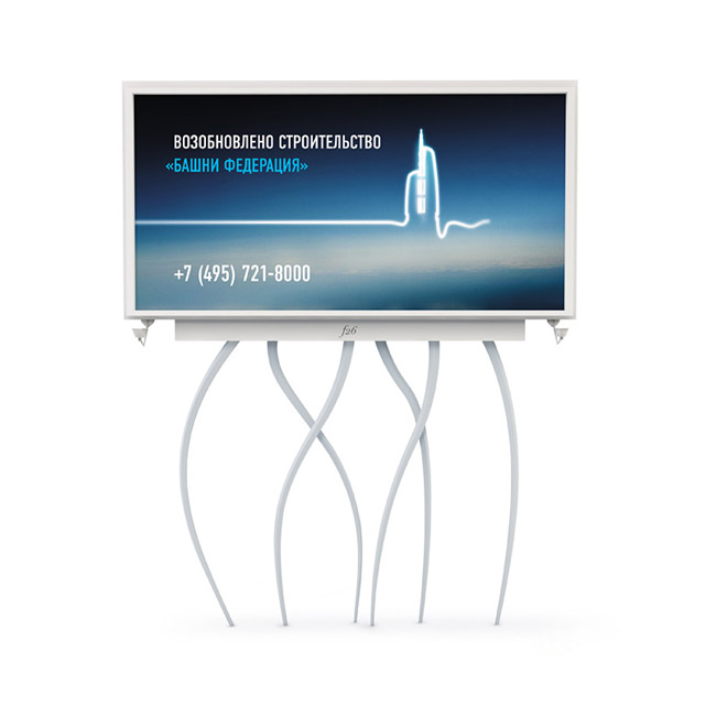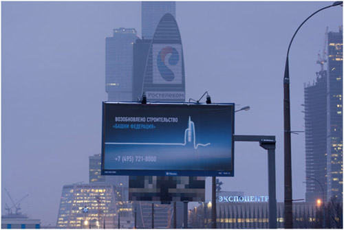 Potok8 запустил сердце башни «Федерация»Креатив разработан в студии F26Студия F26 разработала для компании Potok8 (бывшая Mirax Group) рекламную outdoor-кампанию, анонсирующую возобновление строительства башни "Федерация". Предыдущую рекламную кампанию башни делали в агентстве SmartLab. В конце 2008 года стройка "Федерации" была заморожена на 2,5 года. Всё это время вокруг компании Сергея Полонского не прекращались связанные с этим скандалы и PR-войны. Однако в сентябре 2011 года строительство было разморожено. Компания решила обратить внимание общественности и СМИ на этот факт. Памятуя об известном проекте Potok8 – "живом" сердце в "Миракс Плазе", специалисты F26 решили продолжить тему сердцебиения. Сначала на улицах Москвы появился тизер, изображающий первый удар сердца после паузы. Белая светящаяся линия была выполнена люминисцентной плёнкой, благодаря чему кардиограмма светилась в темноте.