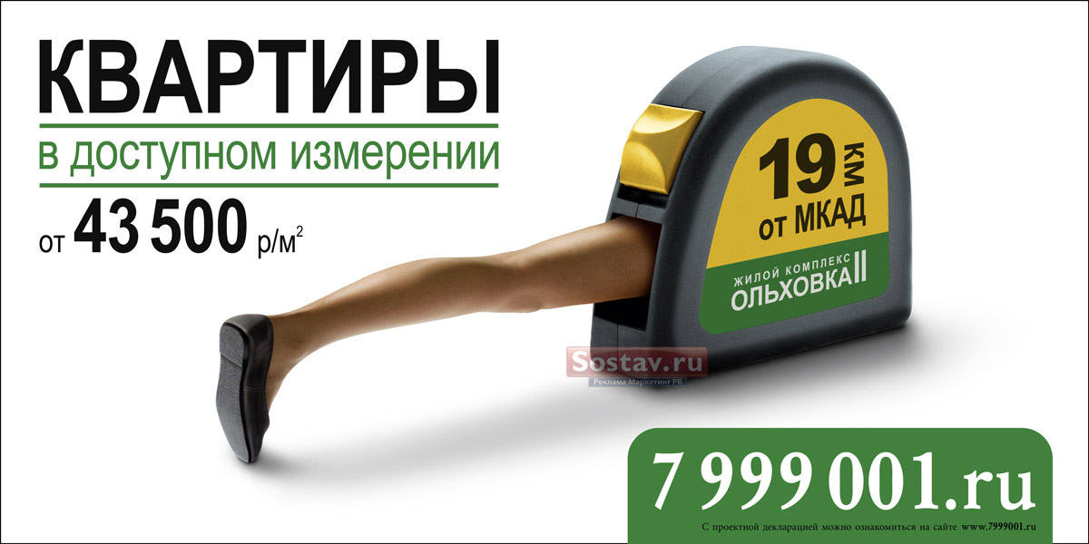 «Ольховка II» сыграла в ногорулеткуАгентство «Медиа-шторм» разработало продолжение рекламы с руконогойДевелопер "Ремикс" запустил очередную рекламную кампанию расположенного в Подмосковье жилого комплекса "Ольховка II". Рекламная кампания акцентирует внимание пользователя на стоимости и степени удаленности рекламируемого объекта от МКАДа. Креативная концепция рекламной кампании разработана агентством "Медиа-шторм". Кампания предназначена для распространения в наружной рекламе, и логически продолжает тему «руконоги», вызвавшей в свое время сильную эмоциональную реакцию читателей Sostav.ru. Кампания проходит под слоганом «реклама в доступном измерении». |