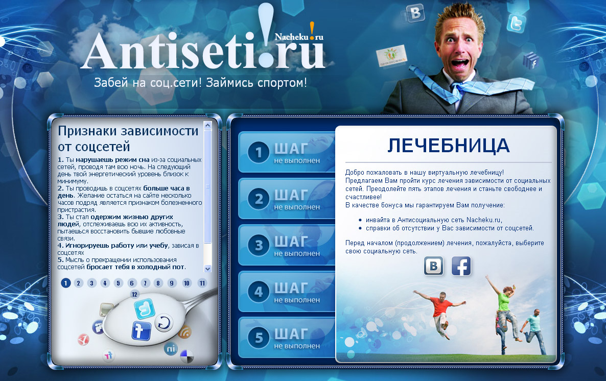 «Восход» разработал креатив для антисоциальной сетиПользователям предложили снять зависимость от соцсетейАгентство "Восход" разработало креативную концепцию рекламной кампании для антисоциальной сети www.nacheku.ru. www.nacheku.ru - антисоциальная сеть, где не нужно общаться и "дружить", чтобы быть в курсе всех общественных, политических, культурных, спортивных событий, а также - лучших новинок Интернет. Как рассказывают в агентстве ежедневно почти каждый из нас просматривает в Интернет массу лишней информации, чтобы найти то, что действительно его интересует: читает бесконечные информационные ленты, отвечает кому-то в социальных сетях. При этом очень сложно провести грань между тем, что действительно интересно и важно и тем, что просто бесполезно отнимает время. Предполагается, что проект Nacheku может раз и навсегда решить эту проблему. Программа изучает предпочтения каждого зарегистрированного пользователя и подбирает ссылки на свежую информацию, интересную именно ему. "Восход" разработал для проекта Nacheku идею рекламной кампании, которая будет состоять из 4 этапов: Сейчас запущен первый этап. По рекомендациям РА "Восход" клиенты разработали сайт www.antiseti.ru , где любой пользователь может пройти курс лечения зависимости от социальных сетей. Каждый, кто прошел пять необходимых шагов, получает справку об излечении и приглашение в проект Nacheku. Разработчики кампании пока не раскрывают секрета последующих этапов. Однако уже известно, что "Восходом" арендован огромный мусоровоз, который весной отправится в тур по крупным городам России. |
