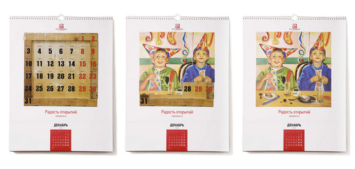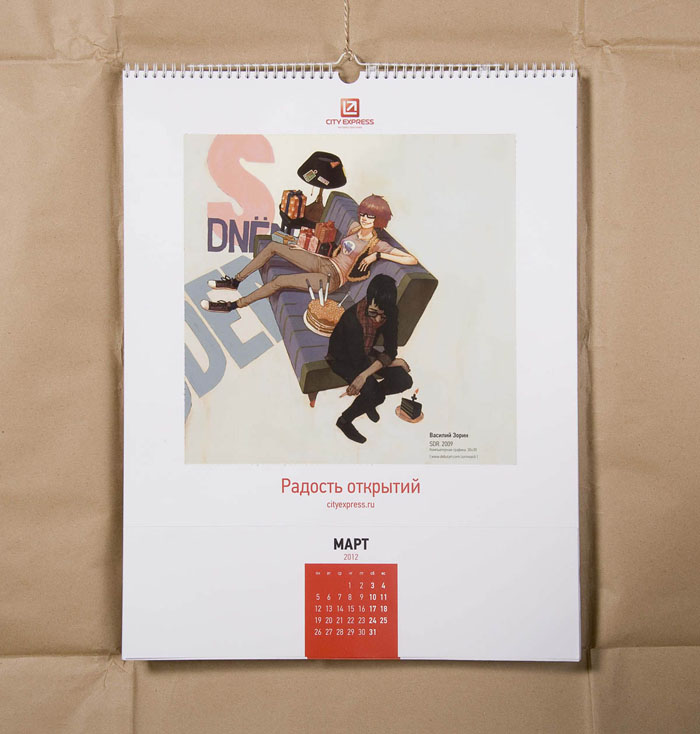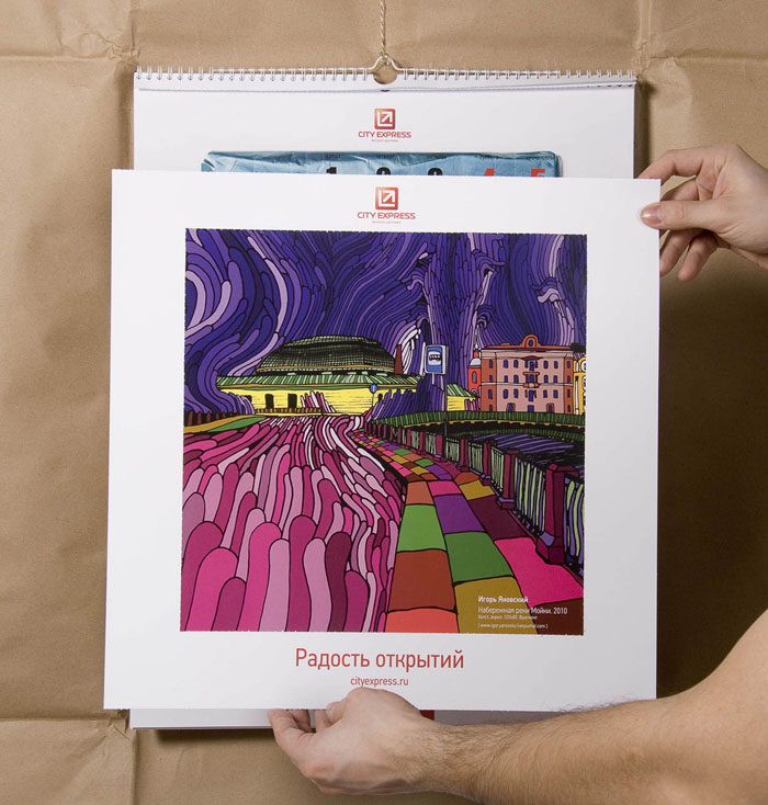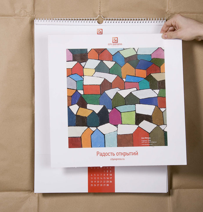Студия DEZA и City Express поделились «Радостью открытий»Агентство и клиент пустили на страницы своего календаря молодых российских художниковАгентство DEZA создало для для компании экспресс-доставки City Express уникальный проект-календарь "Радость открытий", в создании которого приняли участие молодые российские художники. Конструкция календаря трансформируется в экспозицию из 12 картин: в конце месяца от листа календаря отрываются уже ненужные элементы, и картину в паспарту можно вешать на стену. "Начиная работу над проектом , мы попытались представить, что испытывает человек в момент получения письма или посылки, чувство удивления, радости, любопытства, ожидание сюрприза, - ведь не всегда знаешь, что там внутри. А затем мы подумали, что может являться ценным грузом, и решили, что ценным во всех смыслах является искусство, - говорят авторы проекта. - Каждый месяц получаем новую посылку и вскрываем упаковку, пытаясь узнать, что внутри. Каждый лист календаря - двойной: на верхнем листе - изображения упаковок, которые открываются благодаря перфорации, нижний лист - картина одного из современных художников, открывающаяся зрителю постепенно, день за днем".