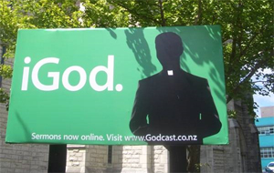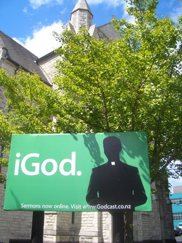 Для рекламы аудио-коллекции своих служб в iTunes церковь St Matthew запустила кампанию iGod. На билбордах была изображена тень священника с белой квадратной колораткой, напоминающей iPod nano.