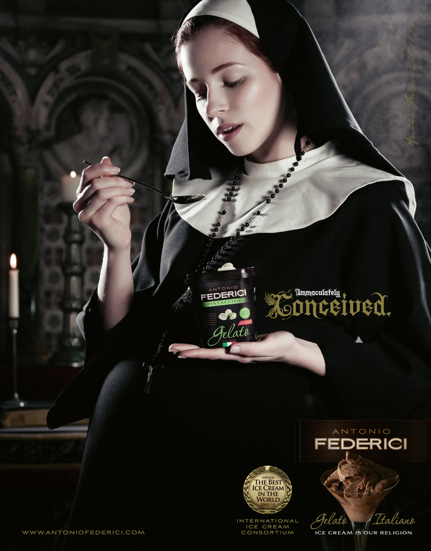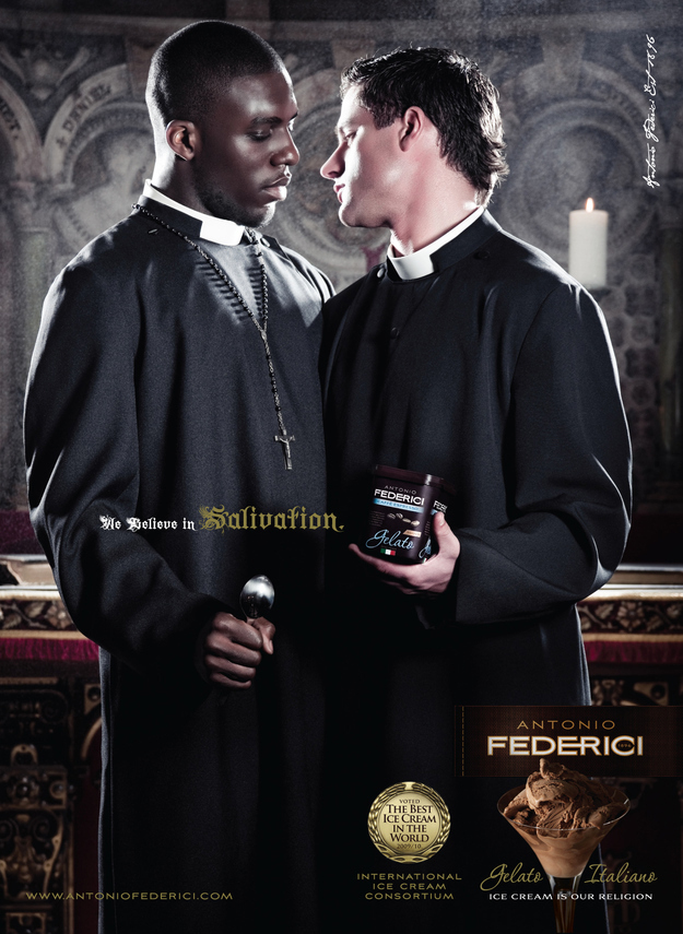 Самый распространенный религиозный образ в рекламе – монахини и монахи. Скандальной стала рекламная кампания мороженого в Англии. Для рекламы бренда Antonio Federici Ice Cream агентство сделало два принта. На первом изображена беременная монахиня. Подпись: «Зачато непорочно. Мороженое – наша религия». На втором два монаха, воспылавшие страстью друг к другу.