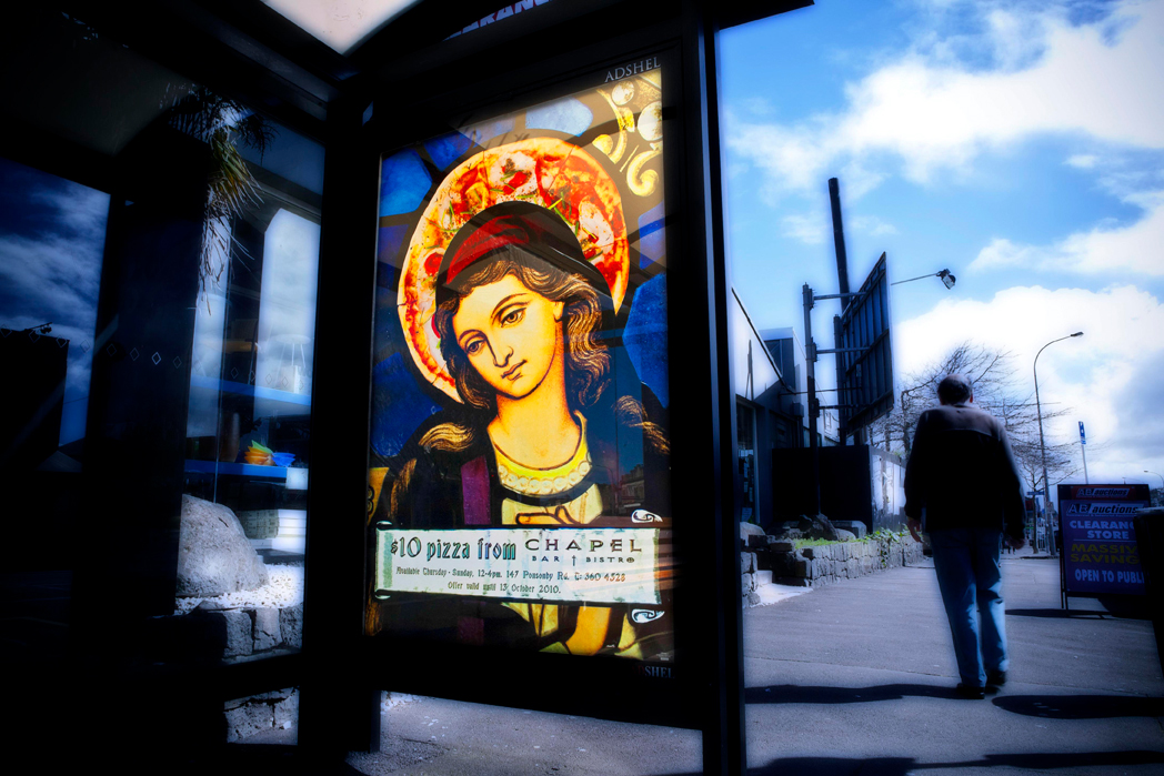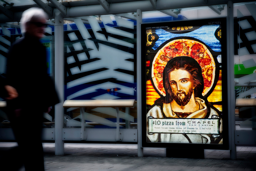 В Новой Зеландии и религию в рекламе используют смело. Нимб в виде пиццы изобразило агентство Ogilvy для наружной рекламы бара Chapel. На такую оригинальную идею агентство натолкнуло само названием бара, ведь слово «chapel» с английского переводится как «часовня». Прямо на автобусных остановках были установлены витражи с изображением Иисуса и Девы Марии, рекламирующие пиццу в Chapel всего за 10 долларов.