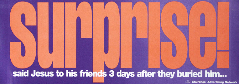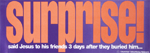 На Пасху же CAN создала принт со слоганом: «Сюрприз!». Внизу под этой написью мелким шрифтом было написано: «Сказал Христос своим друзьям, когда прошло три дня с момента того, как они его похоронили».