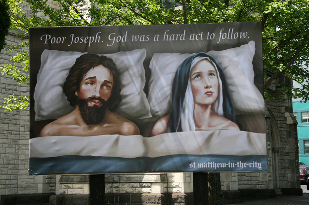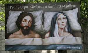 Еще раньше на рождественских билбордах церкви St Matthew изображались лежащие в постели Дева Мария и несколько унылый святой Иосиф. В подписи было написано: «Бедный Иосиф. Следовать за Богом нелегко». Спустя всего несколько часов один из этих билбордов был испорчен мужчиной, который залез на крышу своей машины и облил его коричневой краской. Тогда в церкви заявили, что эта работа агентства M&C Saatchi-Окленд еще не самая радикальная: «Одно рекламное агентство предложило нам проект, на котором со слов песни «Радость мира» (популярная в англиканских церквях рождественская песня) стекала сперма».