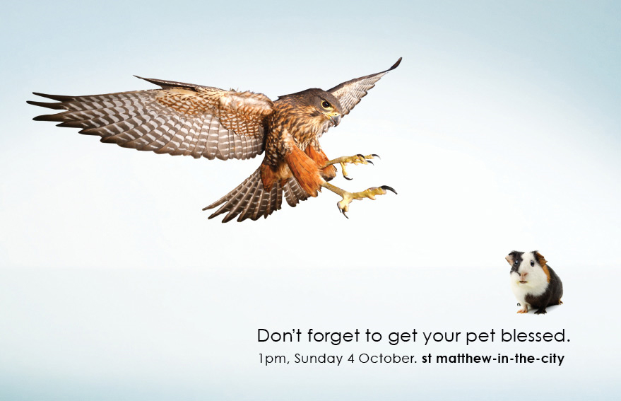 На другом рекламировалась услуга крещения домашних животных. В билборде обыгрывалась идея, что если крестить морскую свинку, ястреб на нее не нападет.
