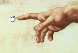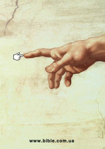 Приближаясь к дому, все труднее найти примеры религиозной рекламы. Отличился украинский ресурс «Твоя библия», который заказал рекламу у агентства Adventa LOWE. Креаторы создали принт с аллюзией на картину Микеланджело «Сотворение Адама». Использован только палец Бога, к которому тянется стандартный значок компьютерной мыши с пальцем.