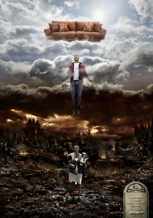 Креаторы отправили мужчину в рай с диваном и спортивным каналомВ аду остались жена и детиИспанское рекламное агентство Tapsa сделало кампанию для продвижения спортивного телеканала холдинга Gol Television. Креаторы решили использовать для принта стереотип о мужчинах, футболе, диванах и их женах. В основе – простое разделение на ад и рай. Креаторы изобразили человека, который устремляется из мрачного быта с женой и детьми в радужные небеса, где его ожидает один лишь диван. Слоган кампании: «Это не то место, куда ты попадешь. Это откуда тебя заберут». Состав творческой группы: |