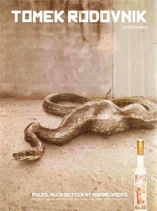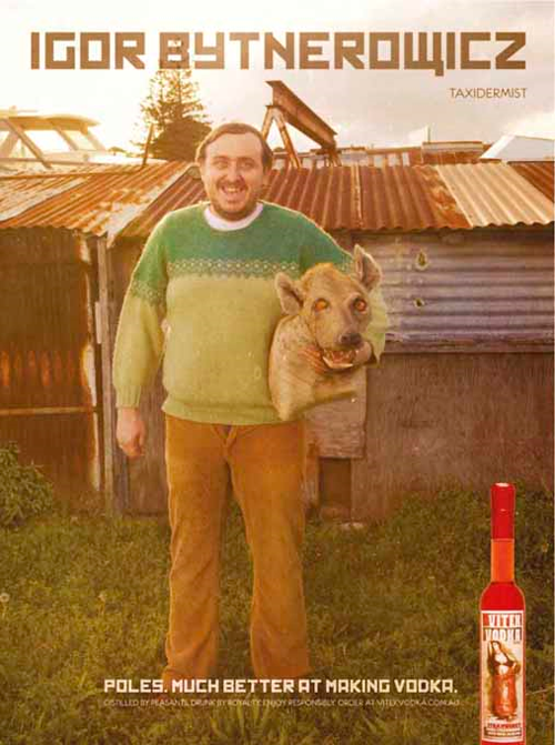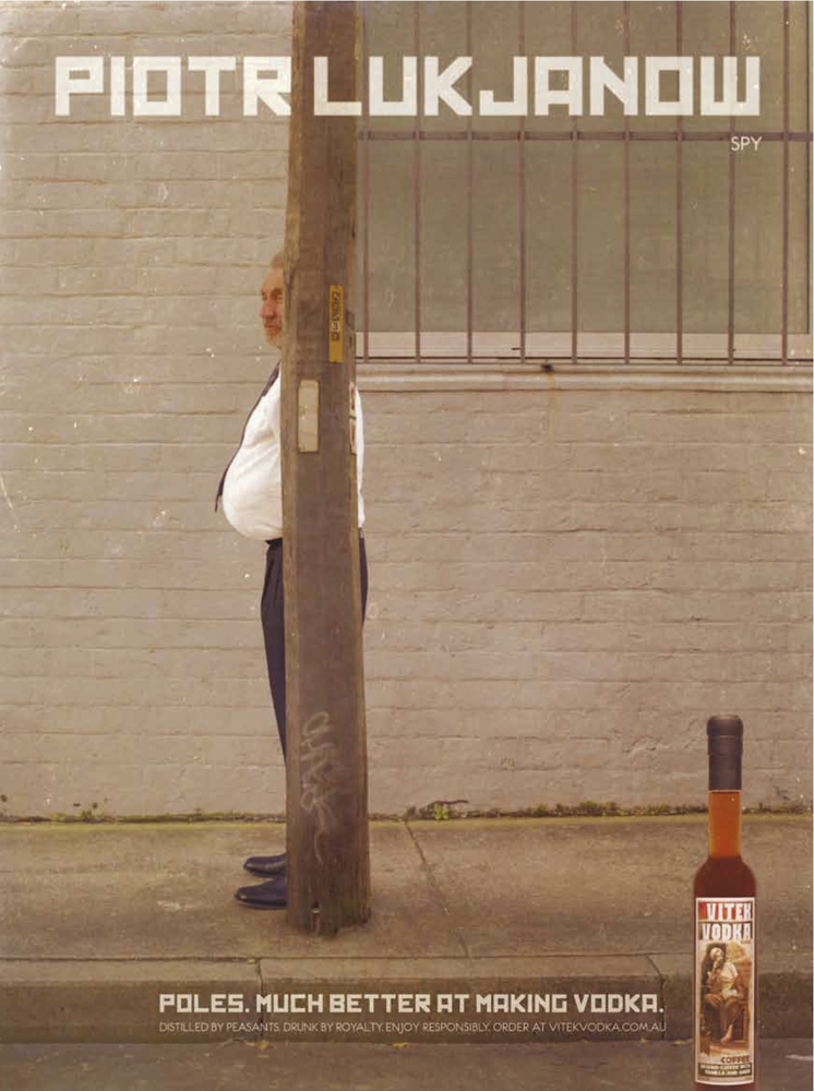 Реклама польской водки появилась в Австралии«Поляки. В производстве водки они лучше»Креативное агентство JayGrey, Sydney создало принт для польской водки Vitek, выпускаемой в Австралии. На нем изображается мужчина с большим животом, пытающийся спрятаться за столб. В подписи написано его имя Piotr Lukjanow и указано, что он шпион. Внизу принта слоган: «Поляки. В производстве водки они лучше». Vitek Vodka выпускается в Австралии польском эмигрантом Vitek Czernuszyn. В своем Facebook он пишет: «Я родился в Польше и рос, наблюдая за отцом – он не только пил водку, но и гнал её. Так что уже подростком я знал, как правильно класть мешок картошки в бутылку. Независимо от того, чем я занимался профессионально, водка всегда была моим хобби. А сейчас она стала моей работой. Без ложной скромности могу сказать, что я один из ведущих специалистов в Австралии по производству водки». На официальном сайте Vitek Vodka можно даже поговорить с создателем.