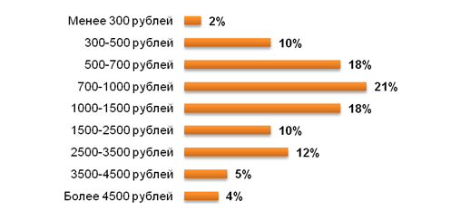 Объем одного заказа составляет в среднем 1,5 тысячи рублей. Хотя почти треть пользователей этой услуги (31%) регулярно заказывают доставку товаров на сумму, превышающую 1,5 тысячи рублей. Интересно, что у возрастной группы, наиболее часто пользующейся данной услугой - 35-44 года, - средний объем заказа ниже (1,3 тысячи рублей), чем у других групп, которые заказывают доставку продуктов на дом реже, но на более крупные суммы.