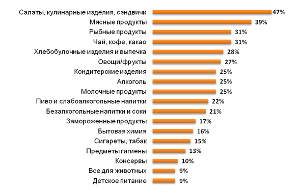 Наиболее популярными категориями товаров являются кулинария (салаты, сэндвичи, др. кулинарные изделия), а также мясные и рыбные продукты, однако предпочтения у разных групп респондентов сильно отличаются.
