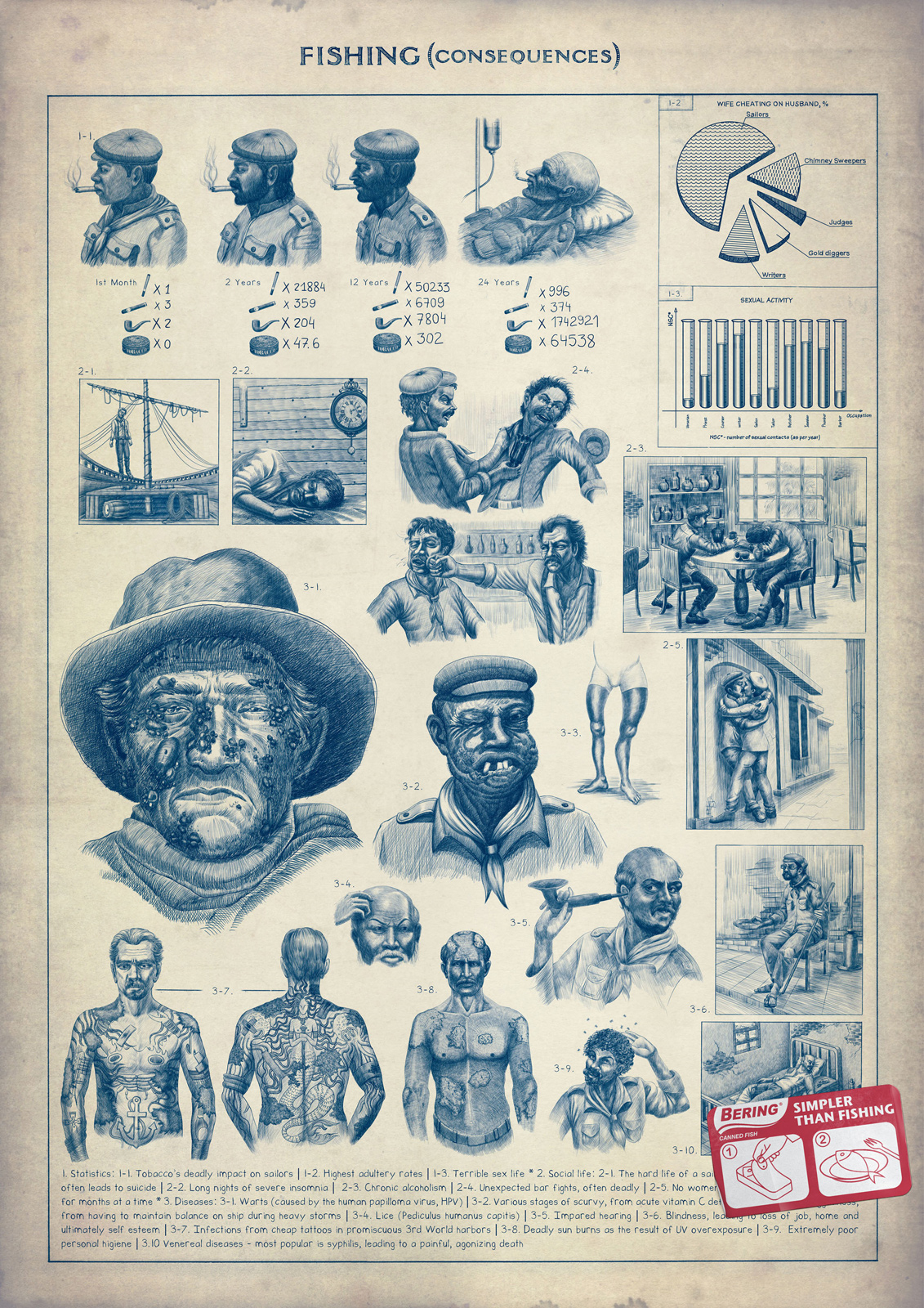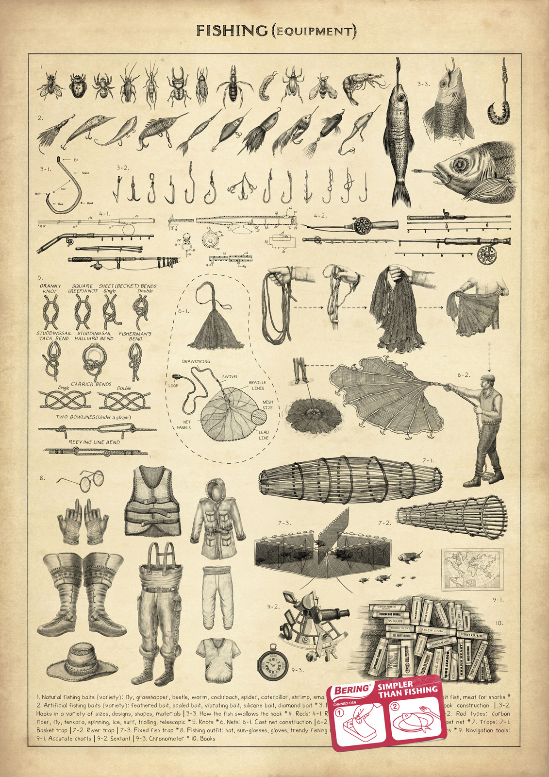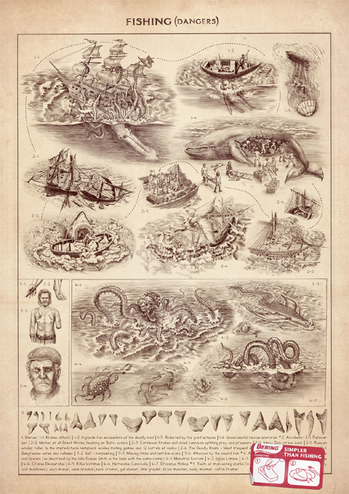 BBDO Moscow описало трудную жизнь рыбаковДля рекламы консервов BeringМосковское BBDO сделало принты для рыбных консервов Bering. На них подробно описываются опасности, с которыми сталкиваются рыбаки, а также необходимое для рыбалки снаряжение. В нижнем углу же рилагается короткая инструкция, как открывать рыбные консервы. Слоган кампании: «Проще, чем рыбалка».