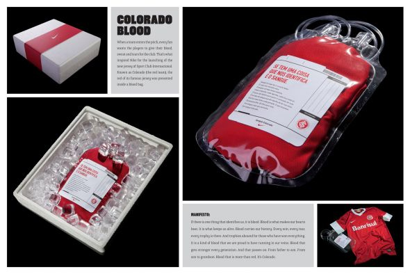 Nike в Бразилии представляет «кровавые» майкиАгентство Nazca Saatchi & Saatchi Brazil создало яркий принт для маек Агентство Nazca Saatchi & Saatchi Brazil создало принт для «New Clubs Sponsorship, Colorado blood» бренда Nike. Компания выпустила новые футболки Sport Club Internacional. На принтах были изобажены красные майки в мешках, которые используют для хранения крови, а так же объяснение, почему была выбрана именно эта упаковка. Похожая идея была использована в принтах другого бразильского агентства Grey141 для Центра крови Бразилии.