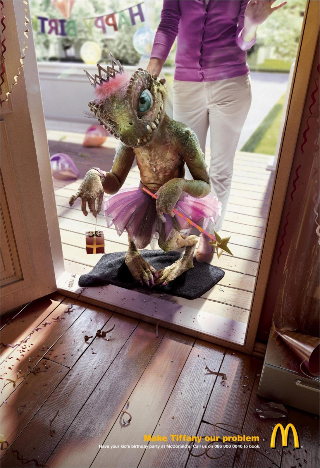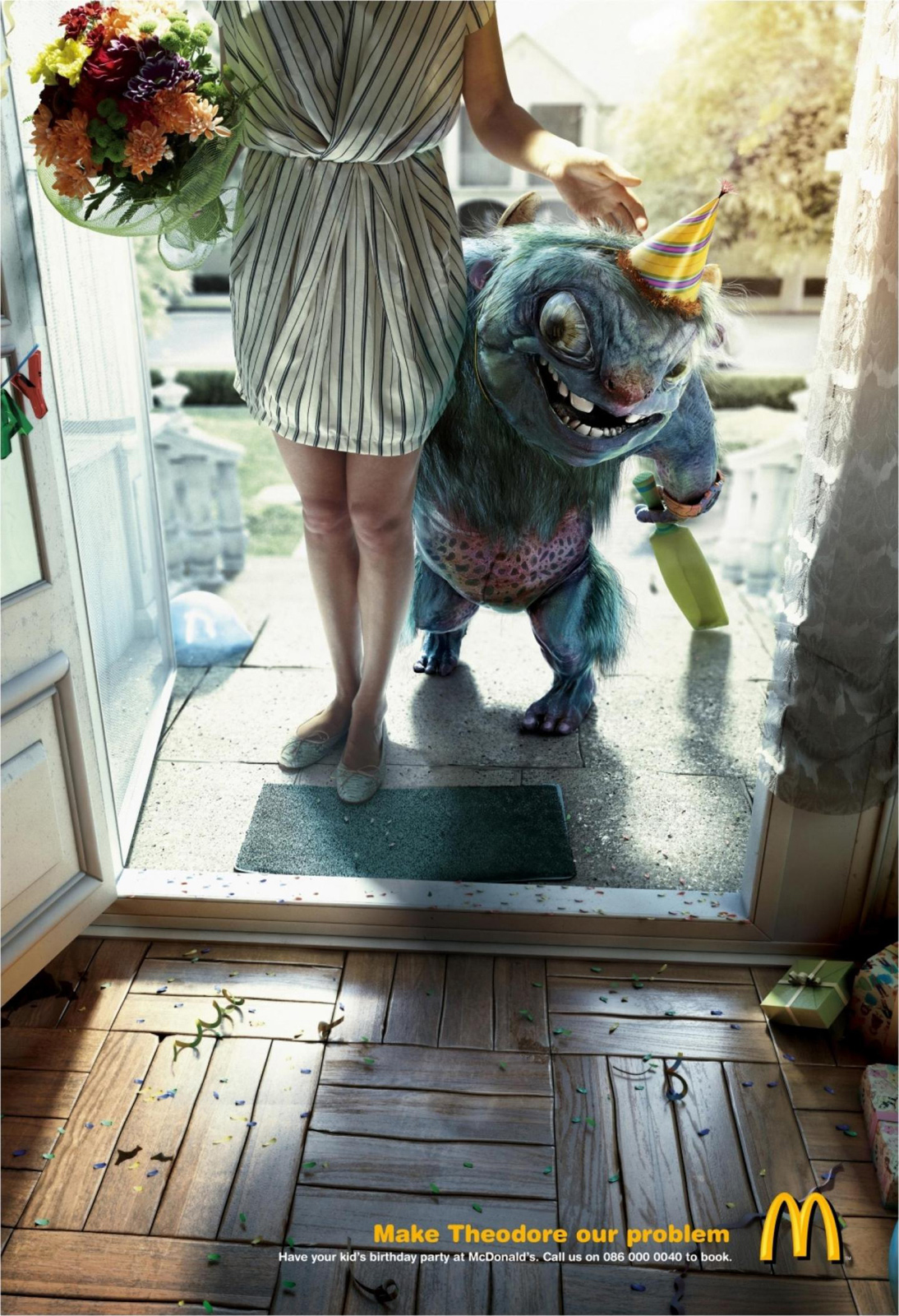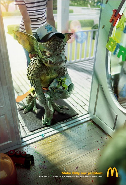 Южноафриканское агентство DDB, Johannesburg создало принты для McDonald’s. На них рекламируется услуга проведения детских Дней рождений. Чудовища в праздничных костюмах входят в дом. Слоган кампании: «Сделай Билли нашей проблемой».