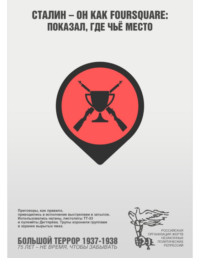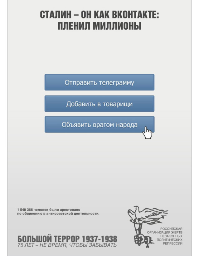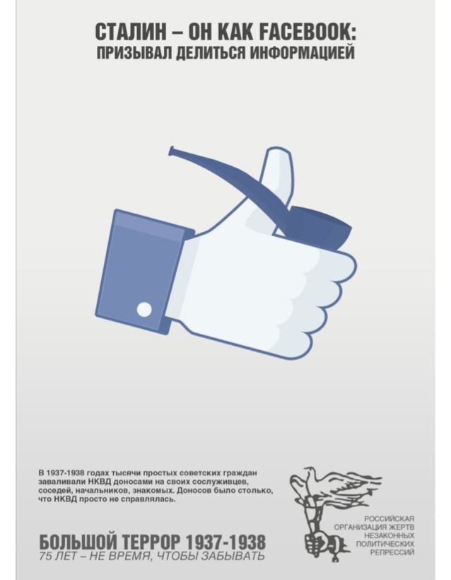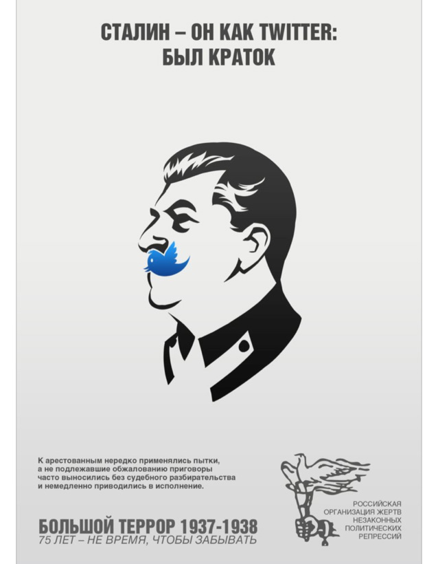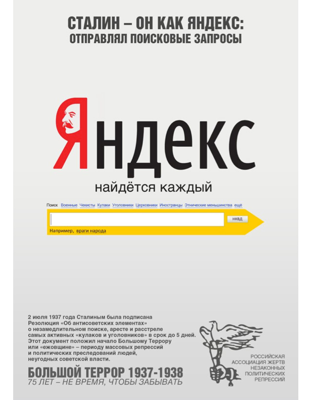 Сталин как Яндекс, Facebook и TwitterСтудент Wordshop представил проект, объясняющий суть репрессий пользователям интернета Студент Академии коммуникаций Wordshop Илья Техликиди представил зачетную работу для Российской ассоциации жертв незаконных политических репрессий, которую он сделал, вдохновившись популярным в Интернете принтом художественной группы Nox-13 про Сталина и Google.