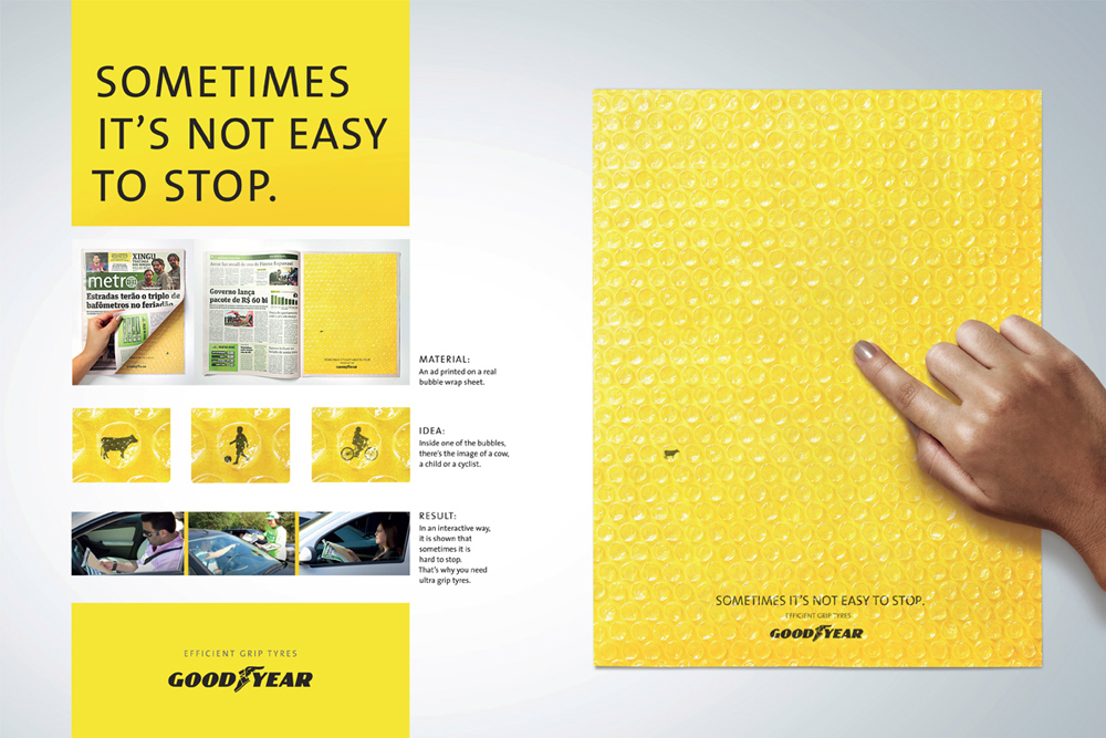 Под пупырчатую пленку формата А4 была нанесена реклама шин Goodyear, а именно: внутри одного из пузырьков оказывался образ ребенка, коровы или велосипедиста, внизу листа располагался слоган: «Иногда остановиться не так просто. Эффективное сцепление шин. Goodyear». Эти рекламные листовки вкладывались в газету Metro и раздавались водителям в пробке.