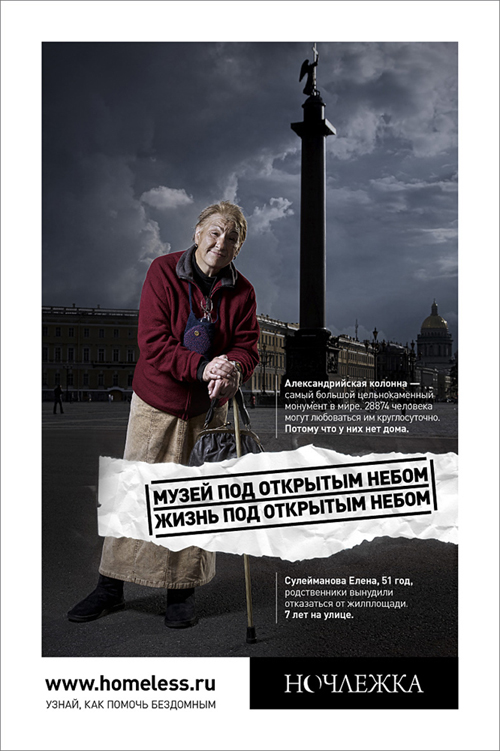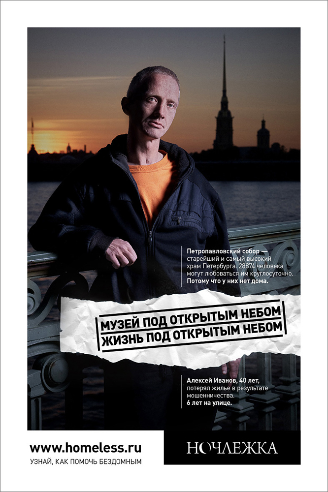 В Петербурге создана кампания в помощь бездомнымКреаторы показали жизнь под открытым небом в ПетербургеВ Петербурге разработана кампания для петербуржской благотворительной организации «Ночлежка», помогающей бездомным. Выражение «Санкт-Петербург - музей под открытым небом» обыграно в слогане кампании: «Жизнь под открытым небом». Бездомные жители города запечатлены в исторических местах города, парадный Петербург противопоставлен Петербургу трудному для жизни и равнодушному к своим жителям. «Идея социальной рекламы проста: бездомные - это не другой биологический вид. Это такие же люди, как и мы с вами. Мы живем в одном городе, ходим по одним и тем же улицам, дышим одним воздухом. Единственное отличие - отсутствие дома, - говорит директор благотворительной организации «Ночлежка» Григорий Свердлин. - К сожалению, сейчас от потери жилья никто не застрахован. А выбраться с улицы только своим силами практически невозможно. Помогать таким людям - задача всего общества, кроме нас им никто не поможет», - продолжает Свердлин. «Наш город гордится своей архитектурой, великолепными памятниками архитектуры, но очень мало делает для профилактики и помощи бездомным. Почему-то этот контраст между парадными фасами и нищетой никому не бросается в глаза. Я предложил сделать стандартную туристическую рекламу, но вместо обязательной блондинки поставить бездомных, - рассказал Sostav.ru копирайтер Иван Квасов. - Изначально слоган был «Посетите Петербург, город бездомных». Но с таким слоганом разместиться на щитах в городе оказалось нереально. Возможно, мы еще к нему вернемся». «Ночлежка» - одна из наиболее профессиональных и опытных организаций в сфере помощи бездомным и малоимущим. Создана в 1990 году. Сейчас реализует гуманитарные проекты: проект развозки еды «Ночной автобус» и зимний проект «Пункты обогрева», а также более сложные проекты по реабилитации людей, их социальному и юридическому сопровождению. «Ночлежка» от всей души благодарит рекламное агентство Great и компанию «Реклама-центр» за поддержку и помощь в реализации проекта. Без них бы этот проект не состоялся. Состав творческой группы: |