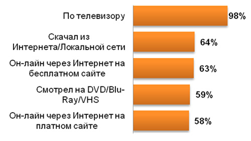Чаще всего россияне смотрят сериалы по телевизору (98%). Второй по популярности способ – скачать сериал из интернета (64%). Почти не уступает ему по распространенности третий вариант – онлайн-просмотр на бесплатном хостинге (63%). Также довольно значительная часть зрителей смотрит сериалы на дисках и через интернет на платных ресурсах