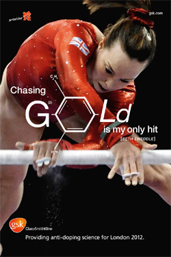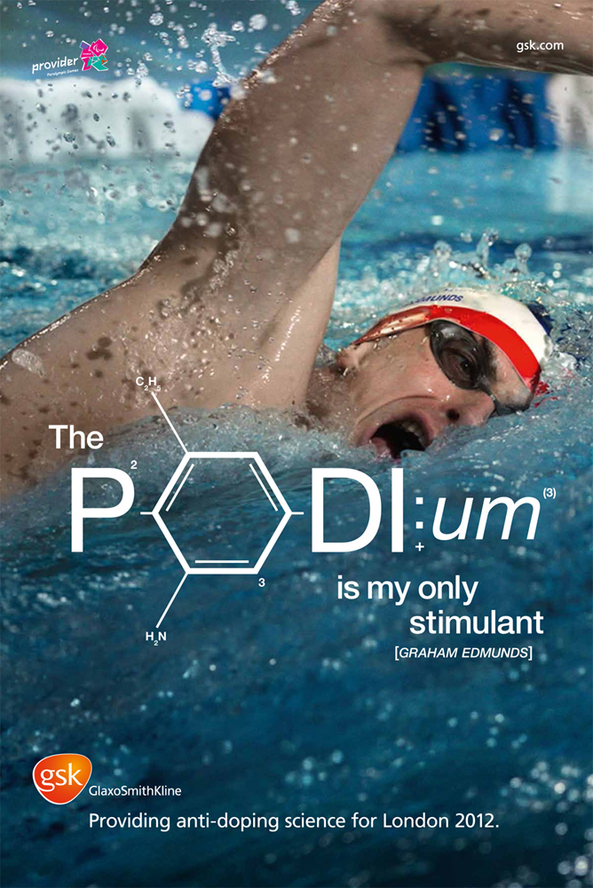 Британская фармацевтическая компания GlaxoSmithKline и агентство TBWALondon разработали кампанию против употребления допинговых средств спортсменами во время Летних Олимпийских игр. В кампании приняли участие британские олимпийские чемпионы: спринтер Марлон Дэвониш (Marlon Devonish), гимнастка Элизабет Тведдл (Elizabeth Tweddle) и пловец-паралимпиец Грэхем Эдмундс (Graham Edmunds). На двух принтах с гимнасткой Элизабет Тведдл и пловцом-паралимпийцем Грэхемом Эдмундсом использованы другие слоганы: «Погоня за золотом – это единственное, что дает мне толчок» и «Подиум – мой единственный стимулятор». Причем надпись сделана таким образом, что напоминает химическую формулу вещества.