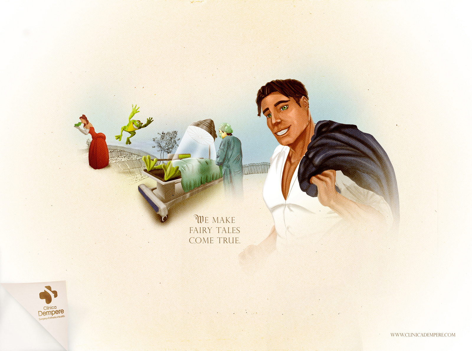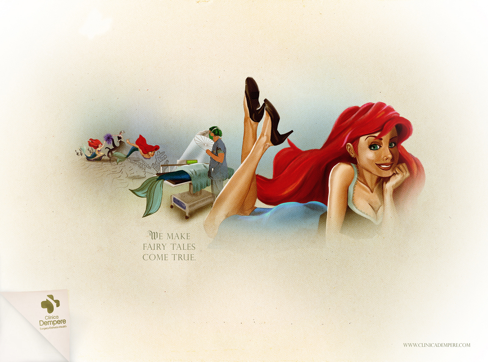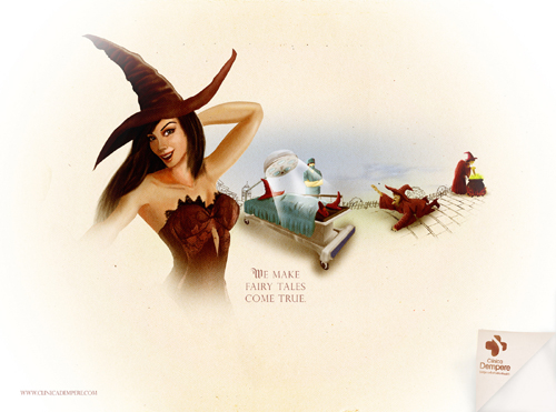Русалочка в рекламе клиники эстетической медициныАгентство ZEA BBDO Venezuela превратило сказки в жизнь Креативное агентство ZEA BBDO, Venezuela разработало кампанию для клиники эстетической медицины Dempere. Креаторы использовали для принтов образы из легендарных сказок. Так, мы видим на операционном столе Русалочку, которая на переднем плане предстает уже с человеческими ногами. Или ведьму в колпаке, которая стала красавицей. Слоган кампании: «Мы делаем сказки былью».