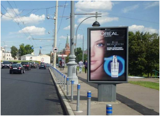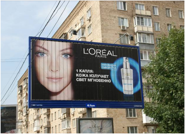 Я всегда рекомендую очень аккуратно использовать черный цвет в наружке. Он сложен для восприятия в городе, сложен и в обслуживании, а на конструкциях с внутренним подсветом может «убить» часть сообщения в темное время. Но в случае с L’Oreal реализация и связь со слоганом «кожа излучает свет» черный цвет использован точно по назначению. В дополнении к светящемуся лицу девушки голубой ореол вокруг флакона дает постеру необходимый баланс.