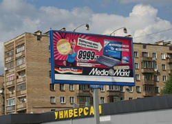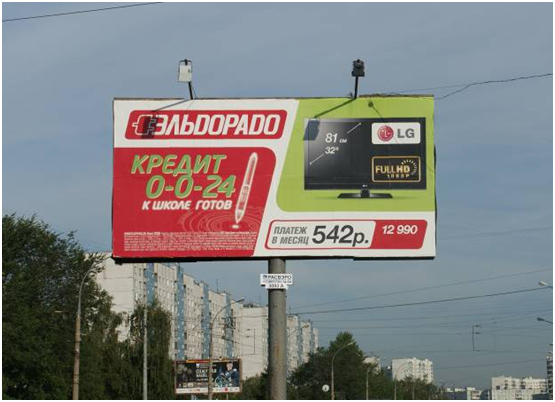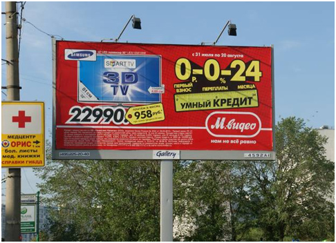 Кредитное предложение у М.Видео читается легче за счет большей контрастности цветов, несмотря на выделенное под эту информацию у Эльдорадо часть постера. Но если у М.Видео присутствует три цены – старая, новая и размер платежа в месяц, то Эльдорадо ограничивается двумя, делая акцент на платеже в месяц. Кроме того, у Эльдорадо очень четкое разделение постера на блоки – «Название-Кредит-Товар-Цена», позволяет дать каждому блоку наибольшую читаемость.