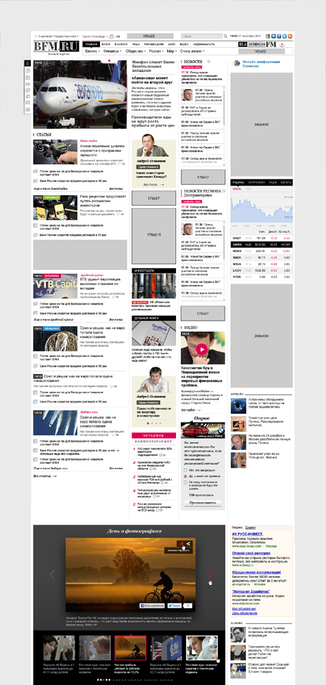 Деловой портал BFM.ru обновил дизайн главной страницы сайта. Над его созданием работало интерактивное агентство Notamedia. В новой версии сайта, которая появится в Сети 4 сентября, о предыдущем дизайне будет напоминать лишь доминирующий в оформлении черный цвет и логотип BFM.ru, рассказали Sostav.ru представители медиакомпании. Внешне сайт приблизился к газетной верстке. Принцип нового дизайна: простота, главные и эксклюзивные материалы на первом месте. Кроме того, на портале появилась «интуитивная» навигация, а улучшенный интерфейс позволяет легко получить доступ к различной информации. Новая структура должна оперативно предоставлять дополнительную информацию о событии и фигурирующих в статье персонах, компаниях, рынке. Деловой портал BFM.ru наряду с радиостанцией Business FM 87,5 входит в медиахолдинг «Румедиа». По данным TNS Web Index, в июне 2012 года ежемесячная российская аудитория сайта составляла порядка 2,4 млн человек. |