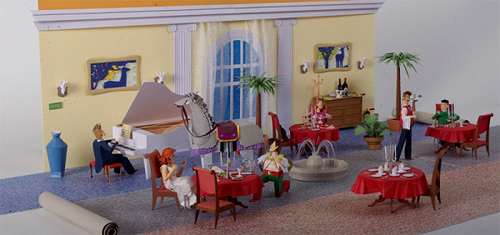 Как видите, персонажи были выбраны самые необычные: от белого коня до Сальвадора Дали. В итоге мы представили 4 сценки. Одна представляла износостойкость покрытий для ресторанов и кафе (покрытий, которые выдерживают даже лошадь и рояль):
