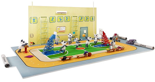 Григорий изобразил панд, которых должны были сделать наши подрядчики, используя технику бумагопластики. Они играли в спортзале на покрытии заказчика Omnisports в баскетбол, таким образом, демонстрируя выносливость покрытия, но в забавной ситуации.