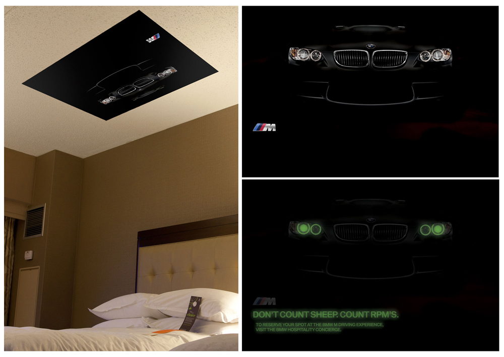 Усыпляющая реклама для BMWАгентство Baldwin& Raleigh поведало, что можно считать, кроме овец Креативное агентство Baldwin&, Raleigh, USA создало необычный принт для немецкого автопроизводителя BMW. Предполагаемое размещение этой рекламы - в гостиничном номере над кроватью. Плакат содержит фосфорические элементы, и в темноте наряду с фарами BMW Golf появляется слоган: "Не считай овец. Считай обороты в минуту". Плакат также сообщает условия, которые позволяют водителям записаться на тест-драйв. Состав творческой группы: |