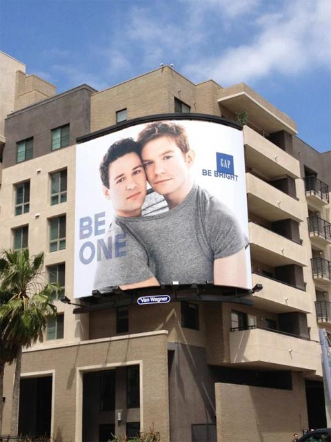 Знаменитый американский бренд одежды GAP в мае этого года разместил наружную рекламу с парнями в одной футболке и слоганом «Будь единственным», «Будь ярким». Над проектом работало агентство Peterson Milla Hooks. ![]()