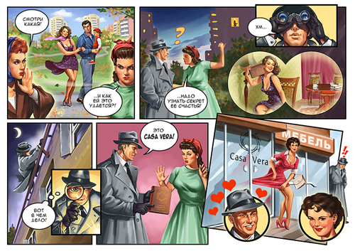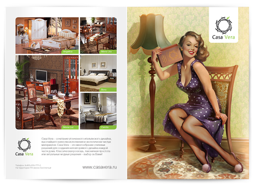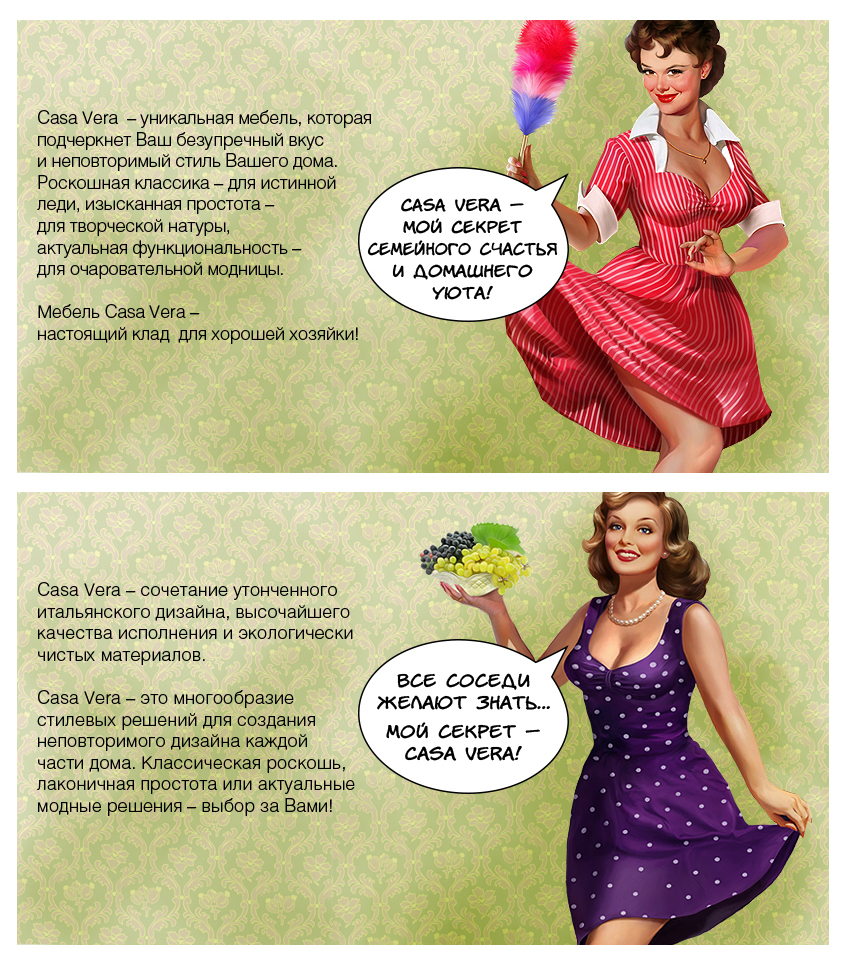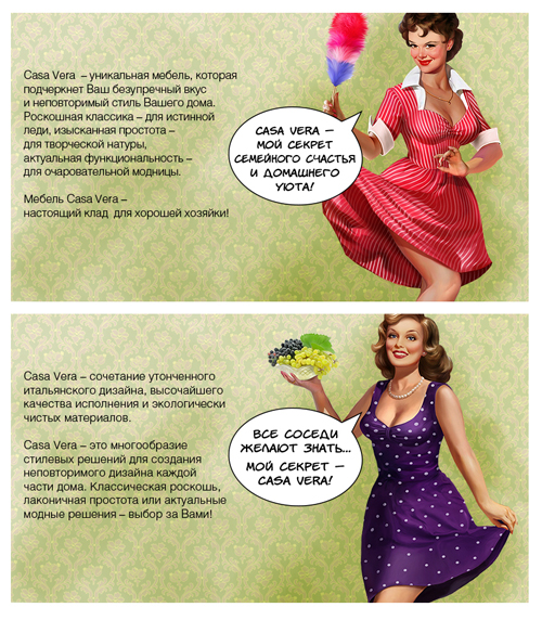 Домохозяйки pin-up в рекламе мебелиАгентство Ad Once разработало кампанию для молодого бренда Casa Vera Креативное агентство Ad Once разработало креативную концепцию рекламной кампании для молодого бренда на рынке мебели Casa Vera. Задача рекламной кампании: обратить внимание потребителя на продукцию в местах продаж. Целевая аудитория: женщины 35-55 лет — в большей степени, мужчины — супруги этих женщин — в меньшей степени. «Наш покупатель — мещанин, практично смотрящий на жизнь, ищущий и высокое качество добротной мебели, и разумную доступную стоимость, - говорят создатели. - Это семейные люди, которые ценят и любят свой дом, гордятся им и не упустят возможности похвастаться перед соседями изящным столиком. Креативная концепция стала олицетворением настоящей семейной мечты об идеальном доме, секрет которого — Casa Vera. «Для мужчин это чистый уютный дом, где тебя всегда ждет сооблазнительная хозяйка, для женщин — модный и стильный дом всем на зависть, где тебя любят и восхищаются твоими кулинарными способностями, безупречным вкусом и внешним видом», - говорят в агентстве. Главная героиня рекламной компании — идеальная хозяйка. Стиль Pin-up был выбран не случайно, ведь это образ скромной соблазнительницы, притягательной и в тоже время по-домашнему милой женщины. Легко узнаваемый стиль, по мнению креаторов, гарантирует, что привлекательный образ не вызовет двусмысленных ассоциаций и ревности у женщин, а наоборот, станет для них «идеалом», тем образом домохозяйки, к которому надо стремиться. Креативным агентством Ad Once были разработаны персонажи главных героинь для ростовых фигур в стиле pin-up, открытка-листовка, баннеры на сайт компании и тематический комикс с оригинальным сценарием. Состав творческой группы: