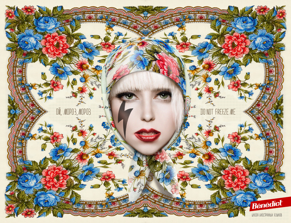 Леди Гага спела «Ой, мороз»В «POWER Креативные Стратегии» разработали рекламную кампанию для Benedict School В Новокузнецке Леди Гагу и Дэниэла Рэдклиффа нарядили в павло-посадские платки. Такие образы в рекламе языковой школы Benedict School использовало агентство POWER. Знаменитости, якобы, исполняют песни, знакомые многим с детства – «Ой, мороз, мороз» и «Пусть бегут неуклюже…». Рядом с русскоязычной фразой из песни приводится ее перевод на английский язык. Рекламная кампания началась с размещения принтов на улицах города и была поддержана в социальных сетях - участники придумывали свои варианты перевода песен. Состав творческой группы: Директор — Софья Балакирева |