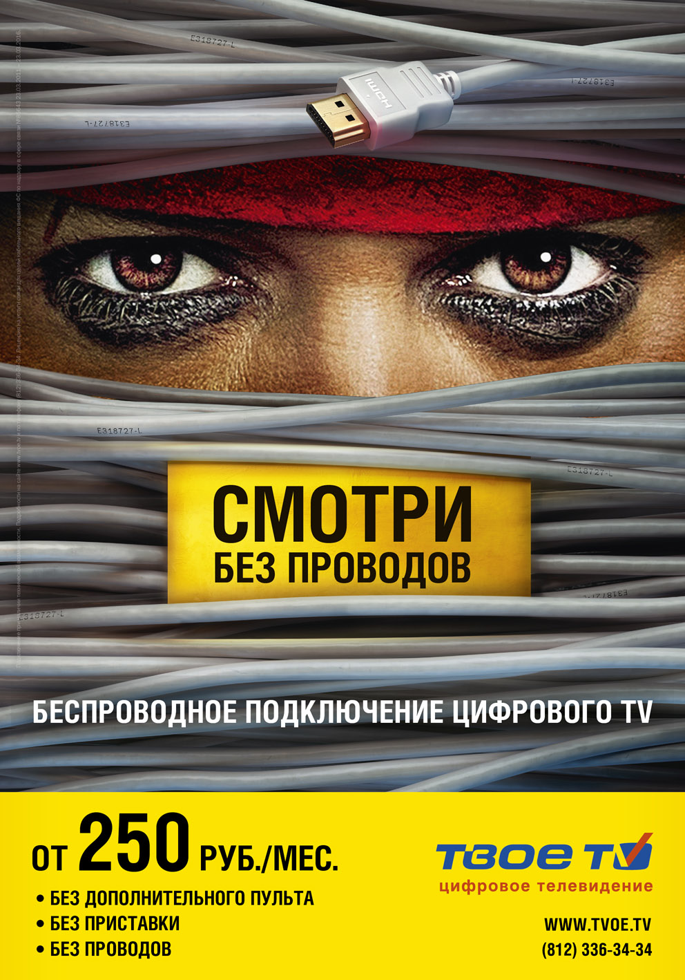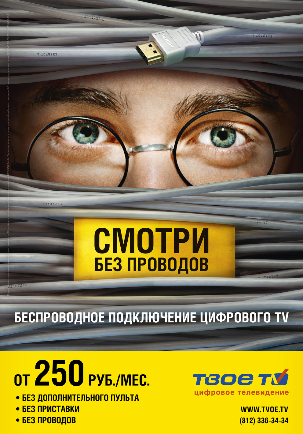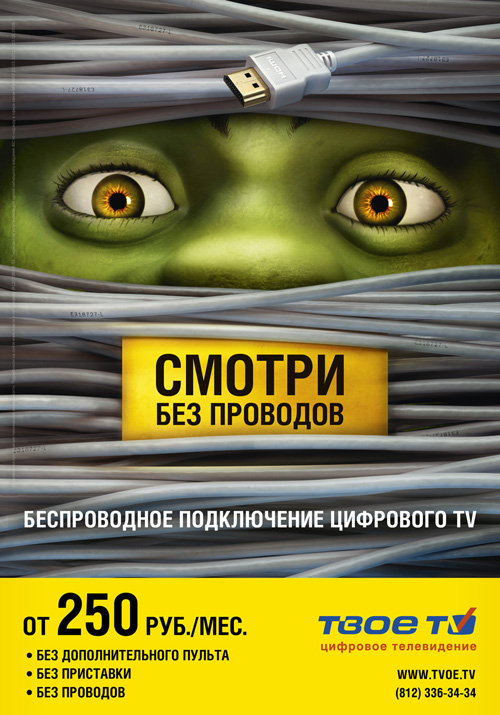 Great и Твое ТВ против проводовАгентство разработало рекламную кампанию для петербургской компании Раньше, чтобы подключить кабельное телевидение приходилось тянуть новые провода через всю квартиру, за которыми уже не было видно и самого фильма. «Смотри TV без проводов» - вот основная идея рекламной кампании, разработанной агентством Great для петербуржской телекоммуникационной компании «ТКТ», которая предлагает абонентам подключить цифровое ТВ. В рекламе использованы образы героев известных фильмов: Гарри Поттер, Шрек, Джек-Воробей, окутанные проводами.