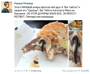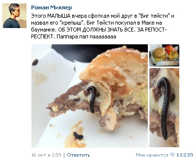Лента крупнейшей российской соцсети пестрит фотографиями одного из наиболее популярных бургеров американского заведения – «Биг Тейсти». В бутерброде виден большой кольчатый червь. Снимок сопровождается подписью: «Этого МАЛЫША вчера сфоткал мой друг в «Биг тейсти» и назвал его «крепыш». Биг Тейсти покупал в Маке на бауманке. ОБ ЭТОМ ДОЛЖНЫ ЗНАТЬ ВСЕ. ЗА РЕПОСТ-РЕСПЕКТ. Паппара пап паааааааа» (орфография и пунктуация - авторские).