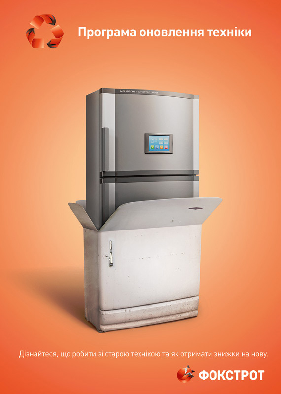 Креативное агентство «Мичурин» разработало принты, сообщающие о программе обновления техники в ТС «Фокстрот. Техника для дома». Суть программы состоит в том, что потребителям предоставляется возможность обменять свою старую (даже нерабочую) технику на новую со значительной скидкой.