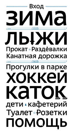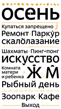 Поэтому стиль, основанный на буквах, на шрифте очень необычен. Это решение не только дает возможность выделить коммуникацию парка, но и демонстрирует своей пластической сдержанностью уважение к посетителям, к их интеллектуальным и эстетическим способностям. А игра со скрытыми сюжетами может бесконечно развиваться и приносить новые неожиданные повороты. Кроме того, наличие такого инструмента, как собственная азбука, позволит создавать необходимые информационные материалы легче и дешевле:)».