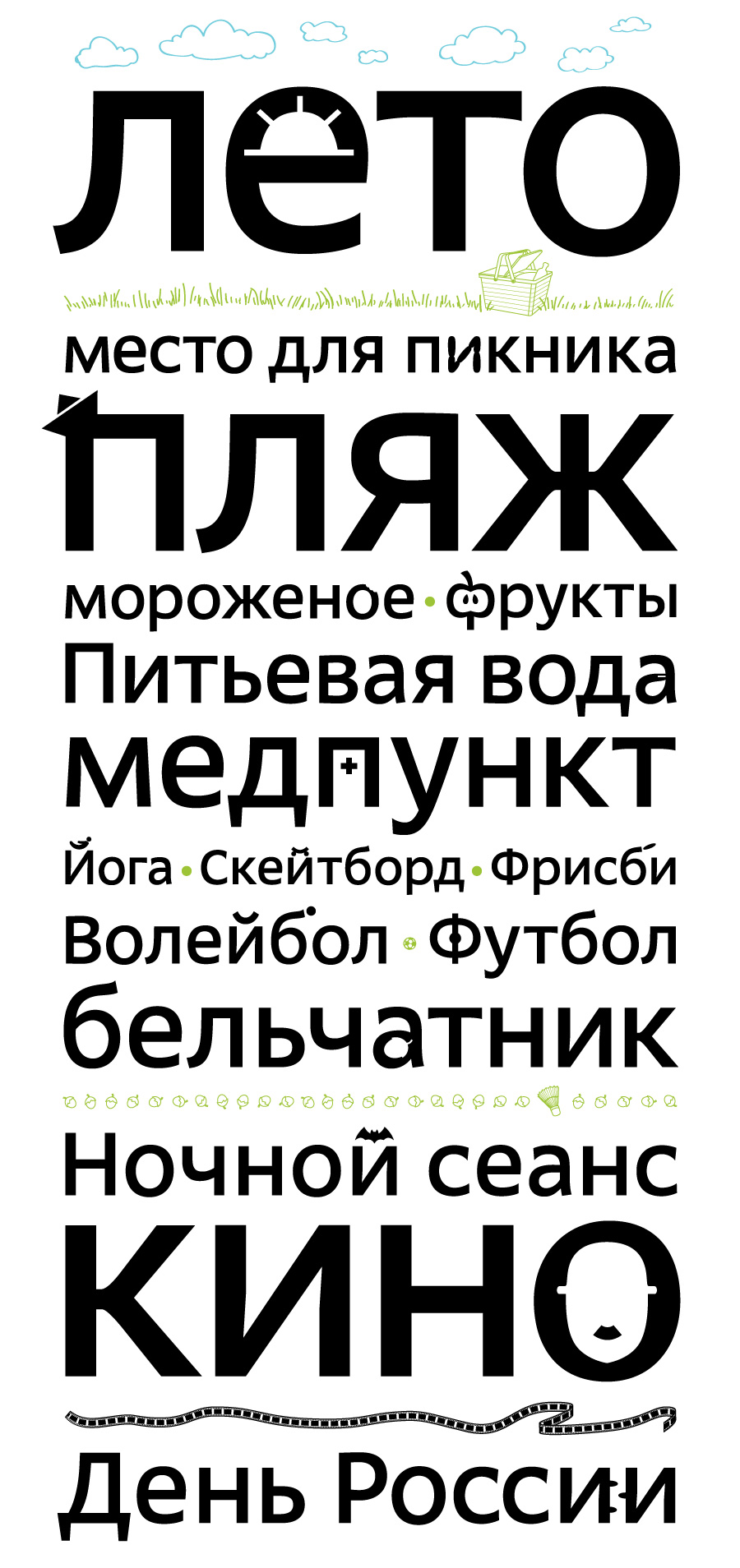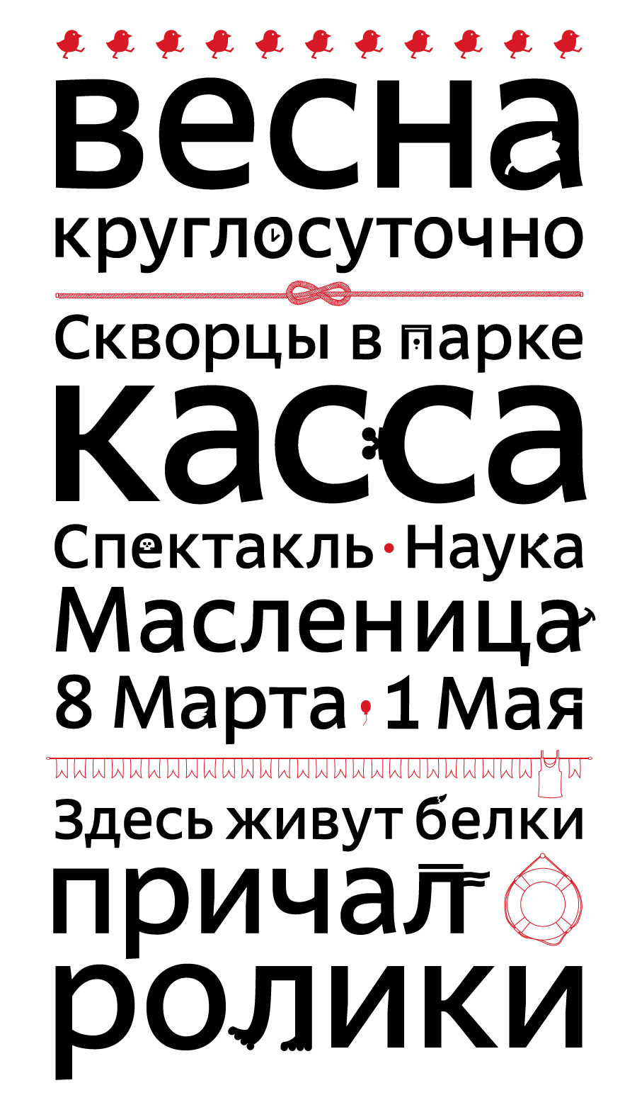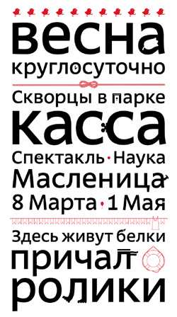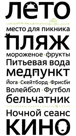 «Картинка в букве на форме или контрформе - один из очень рапространенных приемов, - комментирует арт-директор студии Лебедева Эркен Кагаров. - Однако именно полноценный шрифт, как инструмент, с таким приемом сделан впервые (я имею в виду последние лет 50) студией Лебедева. А вообще шрифты из картинок делали еще в 18 веке:) В России типографические традиции гораздо короче изобразительных.