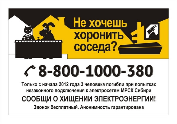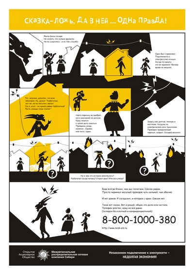 «Алтайэнерго» назвал козлами «воров» энергииНеоднозначная социальная кампания против незаконного подключения к электросети «Алтайэнерго», филиал Межрегиональной распределительной сетевой компании Сибири, запустил социальную кампанию, главная цель которой – объяснить гражданам, что нелегальное подключение к электросети может иметь самые тяжелые последствия. Чтобы донести это сообщение, была придумана «сказка», рассказанная в печатной рекламе с помощью комикса, а также в анимационном ролике. Все рекламные материалы были выполнены в желто-черно-белой гамме, напоминающий знак «Опасно для жизни». Главные герои кампании - Кошка-хозяюшка, Пес-работяга и Козел-хитрец. Последний, конечно же, является отрицательным героем, который незаконно подключается к электросети и тратит деньги своих соседей. Слоган на принтах гласит: «Не хочешь хоронить соседа? Сообщи о хищении электроэнергии». Главное сообщение ролика, который появился в эфире телеканала «Россия 24»: «Незаконное подключение к электросети - недолгая экономия! Кража чужой собственности - уголовно наказуемое преступление». По информации Рекламного портала Алтая, принты перед размещением были высланы на согласование в Методический совет по социальной рекламе. Члены совета похвалили графику и разработанных персонажей, однако высказали опасение, что сообщение кампании «Сообщи о хищении электроэнергии» может быть неверно истолковано как «Стучи на своего соседа». |