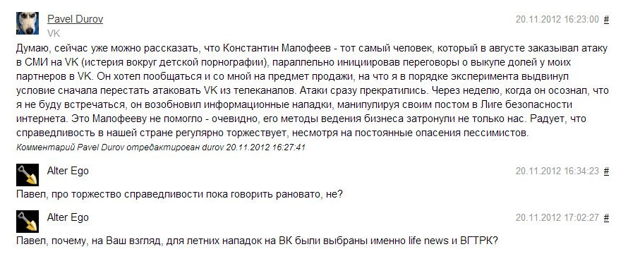 Гендиректор соцсети «ВКонтакте» Павел Дуров раскрыл подробности июльской атаки борцов с педофилами. Тогда движение «Охотники за головами» обвинило ресурс в распространении детской порнографии. Когда стало известно о проведении обысков у миноритарного акционера «Ростелекома» Константина Малофеева, именно его Дуров назвал заказчиком информационной кампании. «Малофеев – тот самый человек, который в августе заказывал атаку в СМИ на VK (истерия вокруг детской порнографии), параллельно инициировав переговоры о выкупе долей у моих партнеров», – написал глава соцсети на сайте Roem.ru. По словам Дурова, владелец фонда Marshall Capital предлагал ему договориться о продаже «ВКонтакте». «В порядке эксперимента выдвинул условие сначала перестать атаковать VK из телеканалов. Атаки сразу прекратились. Через неделю, когда он осознал, что я не буду встречаться, он возобновил информационные нападки, манипулируя своим постом в Лиге безопасности интернета», – рассказал основатель соцсети. Он добавил, что его радует торжество справедливости в нашей стране. Малофеев и президент «Ростелекома» Александр Провоторов фигурируют в уголовном деле о хищении кредита у британской «дочки» банка ВТБ – VTB Capital Plc. Малофеев также является председателем правления «Лиги безопасного интернета». Как сообщает Roem.ru, в офисе организации уже начались обыски. |