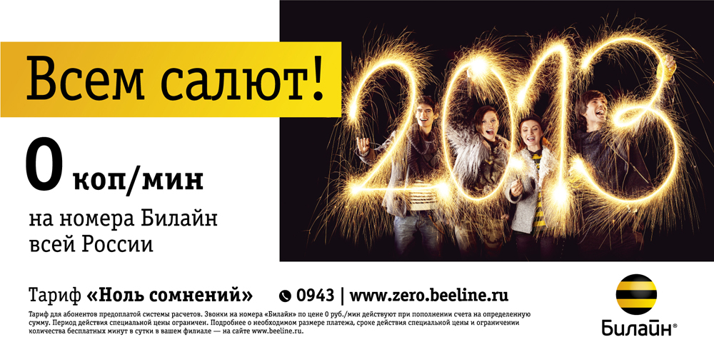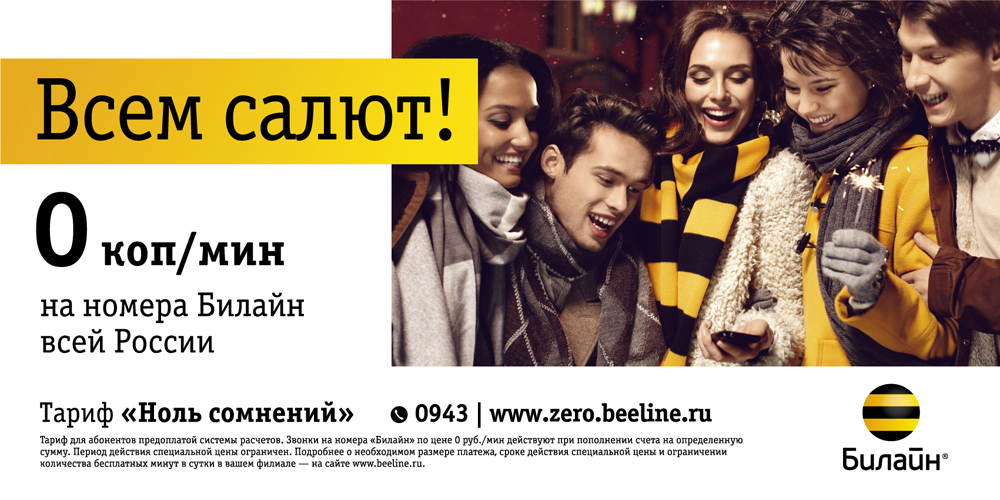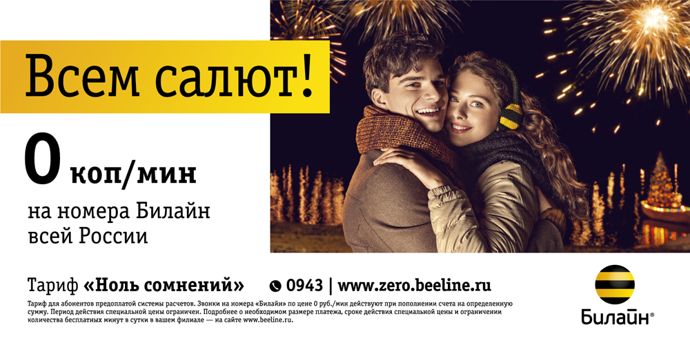 «Билайн» запустил новогоднюю кампаниюАгентство Contrapunto показало, что объединяет абонентов в новогоднюю ночь Ведущий российский телеком-оператор «Билайн» начинает рекламную кампанию тарифного плана «Ноль сомнений», приуроченную к новогодним праздникам. Креативная концепция была разработана агентством Contrapunto. В основе идеи — желание каждого человека в новогоднюю ночь ощутить себя частью чего-то общего: частью семьи, дружеской компании, всей страны. Всех людей объединяет один праздник, одни чувства. По мнению создателей, их также объединяет тариф «Ноль сомнений», благодаря которому можно бесплатно позвонить в любую точку России и почувствовать себя рядом с близкими людьми. Идея реализуется с помощью истории путешествия Нового года по часовым поясам. В момент, когда Новый год наступает в одном городе, его звонком, как эстафетной палочкой, «передают» в другой город. В рекламной кампании задействованы ТВ, наружная реклама и Интернет. Состав творческой группы: Агентство: Contrapunto Креативный директор — Людмила Баушева Арт-директор — Алексей Павлов Старший копирайтер — Кристина Денина Group Account Director — Галина Шибанова Account Director — Андрей Миронов Старший продюсер — Екатерина Бармак Продакшн: Metrafilms Генеральный продюсер — Артем Васильев Продюсер — Галина Калинина Режиссер — Nicolas Caicoya |