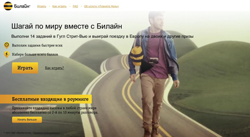 Hungry Boys запустили онлайн-квест для «Билайн»Интерактивный проект создан на основе Google Street View Телеком-оператор «ВымпелКом» (бренд «Билайн») запустила онлайн-игру в поддержку услуги «Планета Ноль», действующей во всех странах международного роуминга. Над проектом работало креативное агентство Hungry Boys. Поиграть в квест от «Билайн» на основе Google Street View можно до 24 декабря. Участникам предлагается совершить виртуальное путешествие по городам мира и, ориентируясь по компасу, отыскать спрятанные памятники или архитектурные детали. Каждый день будет появляться новое задание в новом городе. Для тех, кто пройдет квест быстрее всех и соберет максимум бонусных заданий, приготовлены призы – 3 путевки на двоих в Европу. Кроме того, ежедневно участники могут побороться за туристические путеводители от мобильного оператора. Состав творческой группы: Креативное агентство Hungry Boys Творческая команда "Билайн" |