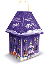 Ассортимент подарков от Milka включает «Рождественский домик» – набор шоколадных фигур в железном подсвечнике домике, набор «Новогодний» из разнообразных шоколадных фигур и мини-плиток в картонной упаковке, и набор «Игрушки на елку» – три фигурки Деда Мороза, которыми можно быстро и нарядно украсить новогоднюю елку.