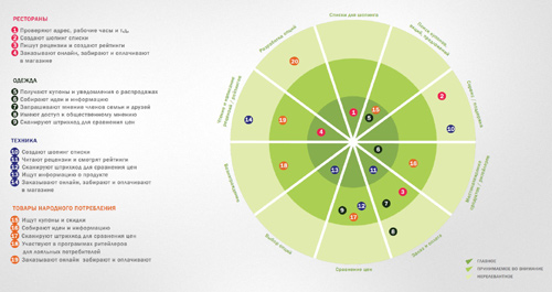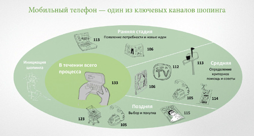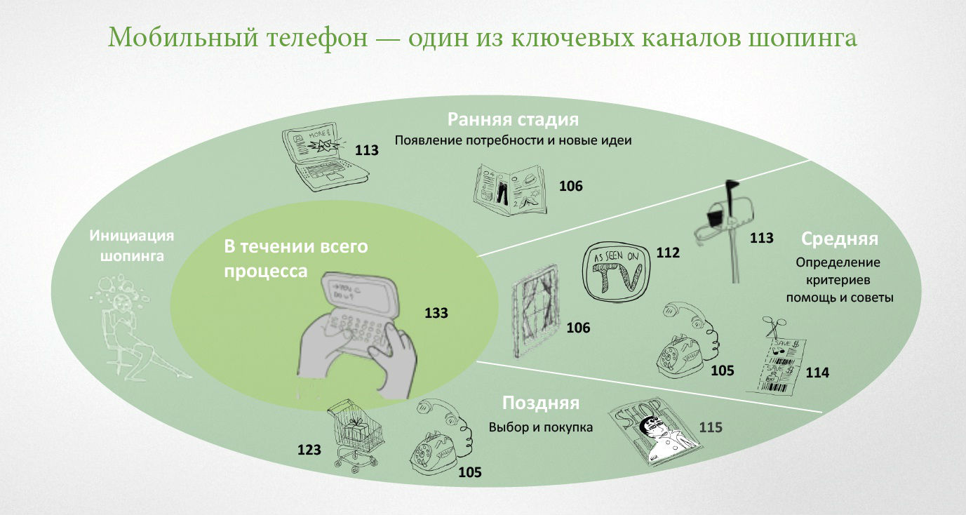 86 % россиян используют более одного канала в процессе шопинга («Многоканальный покупатель», Leo Burnett Moscow, 2011). Мобильный телефон используется на всех стадиях процесса покупки: от выявления потребности, знакомство с новыми идеями до поиска советов, помощи, определение критериев выбора и совершения покупки.