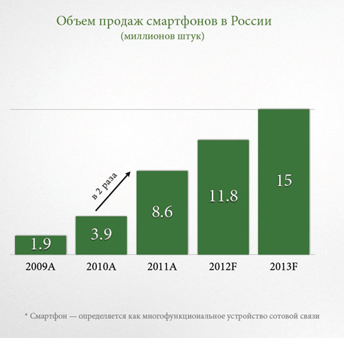 Объем продаж смартфонов в России вырос в 3 раза за 2 года. Постоянно снижается их стоимость: за последние 3 года средняя стоимость смартфона сократилась на 33%. В 2013 планируется, что будет продано 15 млн. штук и доля смартфонов в общих продажах мобильных устройств составит почти 40%. Люди все чаще используют мобильные устройства для выхода в Интернет. За последние три года мобильный интернет вырос на 20%.